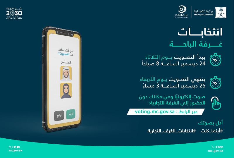 تبدأ في الساعة الثامنة من صباح الثلاثاء 23 / 6 / 1446 هـ الموافق 24 /12/ 2024م، عملية التصويت في انتخابات مجلس إدارة الغرفة التجارية بالباحة للدورة (1446_1450هـ)،وتستمر حتى الساعة الثالثة من عصر الأربعاء 24/6/1446هـ، الموافق 25/12/2024م، وفق نظام الغرف التجارية الذي يعمل على تعزيز الشفافية ورفع كفاءة أداء الغرف.