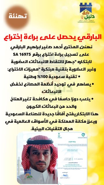 أحمد البارقي يسجل براءة إختراع لإبتكاره " جهاز لالتقاط الانبعاثات العضوية وغير العضوية بتقنية مبتكرة " .
