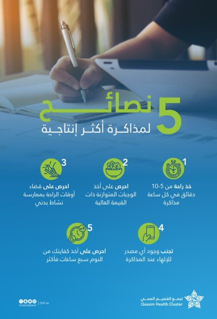 تجمُّع صحي القصيم يوجّه 5 نصائح لاستذكار أكثر إنتاجية