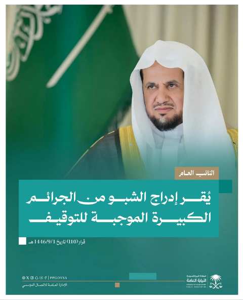 وصدر قرار معاليه رقم (110) وتاريخ 1446/9/1هـ بإضافة فقرة رقم (26) إلى قرار معاليه رقم (1) وتاريخ 1442/1/1هـ لتصبح بالنص الآتي: (تُعدّ جميع الأوصاف الجرمية المتصلة بمادة الميثامفيتامين “الشبو” من الجرائم الكبيرة الموجبة للتوقيف).