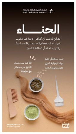 قدمت هيئة الغذاء والدواء في منشور لها نصائح لمستخدمي الحناء لاعتبار أنه خيار طبيعي لتلوين الشعر بشرائها من مصادر ومحلات موثوقة وتجنب خلطها بمواد كيميائية .