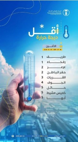 سجلت محافظتا طريف ورفحاء بمنطقة الحدود الشمالية اليوم أقل درجة حرارة بالمملكة بدرجة مئوية واحدة، وذلك بحسب تقرير المركز الوطني…