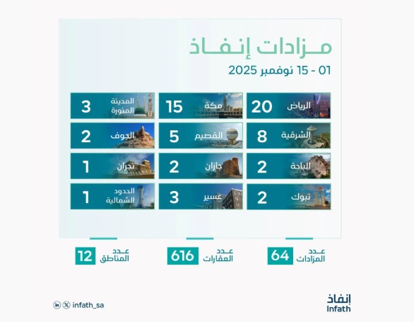 أعلن مركز الإسناد والتصفية “إنفاذ”، إقامة (64) مزادًا علنيًا ما بين حضوري وإلكتروني، لتصفية وبيع (616) أصلًا متنوعًا في عددٍ…