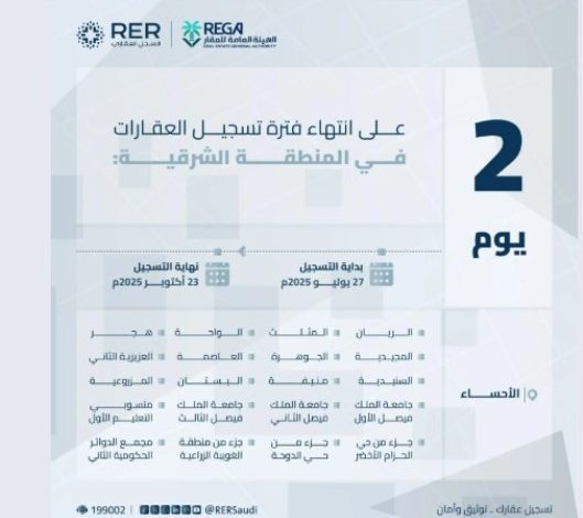 أعلنت الهيئة العامة للعقار عن قرب انتهاء المهلة المحددة للتسجيل العيني الأول للعقار لـ 14878 قطعة عقارية في محافظة الأحساء…