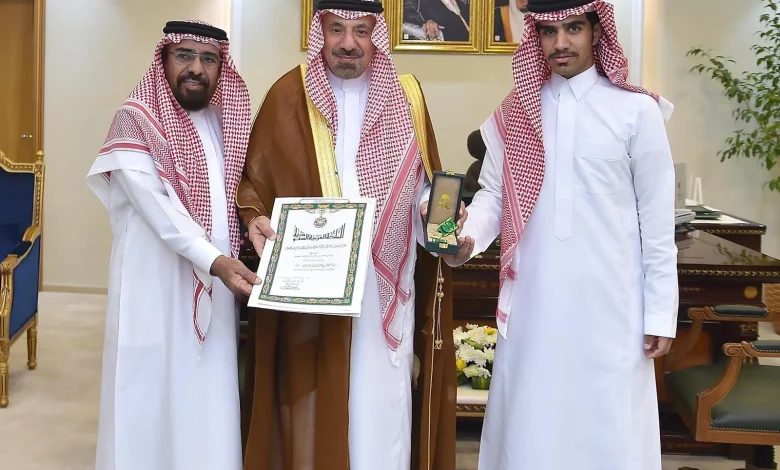 سلّم صاحب السمو الأمير جلوي بن عبدالعزيز بن مساعد أمير منطقة نجران، بمكتبه اليوم، الشاب سالم بن حسن الصيعري، وسام…