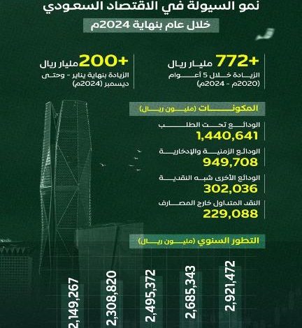 حققت مستويات السيولة “النقود المتاحة” في منظومة الاقتصاد السعودي، نموًا سنويًا بقيمة تُقدر بـ 236,129 مليون ريال، وبنسبة 9 %،…