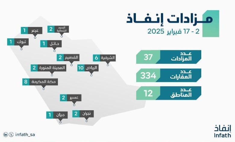 أعلن مركز الإسناد والتصفية “إنفاذ” إقامة 36 مزادًا علنيًا ما بين حضوري وإلكتروني؛ لتصفية وبيع 334 عقارًا سكنيًا وتجاريًا، إضافةً…