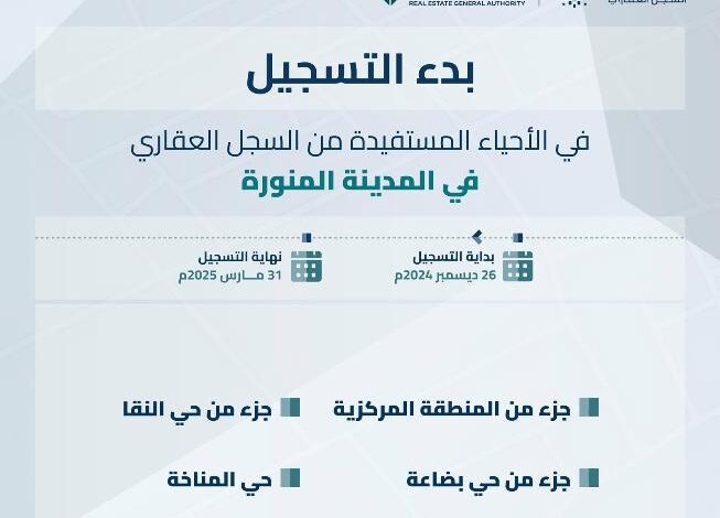 أعلن السجل العقاري اليوم, بدء استقبال طلبات التسجيل العيني الأول لـ (370) قطعة عقارية في 4 أحياء بالمدينة المنورة. ويشمل…