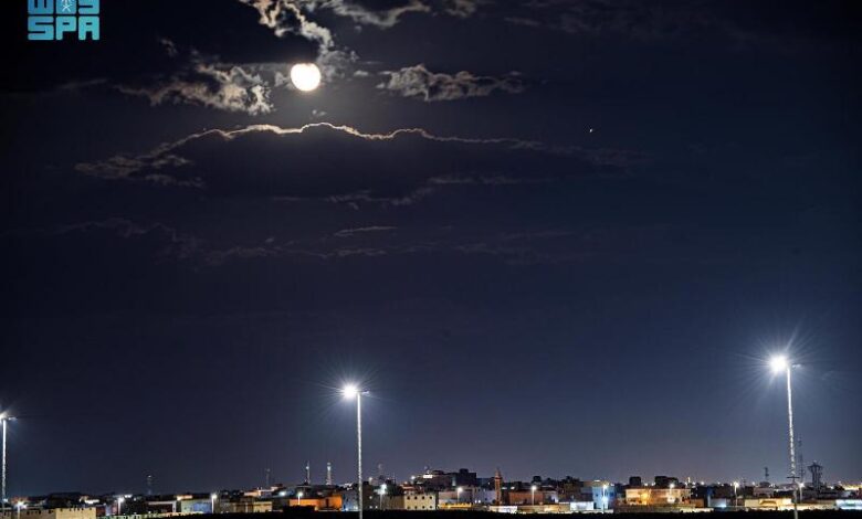 رُصد مساء اليوم في سماء مدينة عرعر بالحدود الشمالية، اقتران القمر العملاق بكوكب المشتري عملاق المجموعة الشمسية، باتجاه الأفق الشرقي…
