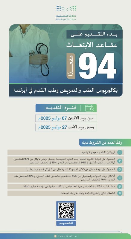 أعلنت #وزارة_التعليم عن بدء التقديم على مقاعد الابتعاث لبكالوريوس الطب والتمريض وطب القدم في أيرلندا، وذلك ضمن مسار الاتفاقيات الصحية.